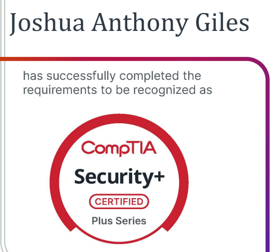 Earned my CompTIA Security+ certification through dedicated self-study and hands-on practice, gaining a solid understanding of cybersecurity fundamentals including threat management, risk mitigation, and network security. This certification reflects my commitment to securing systems and staying current in today’s evolving threat landscape.